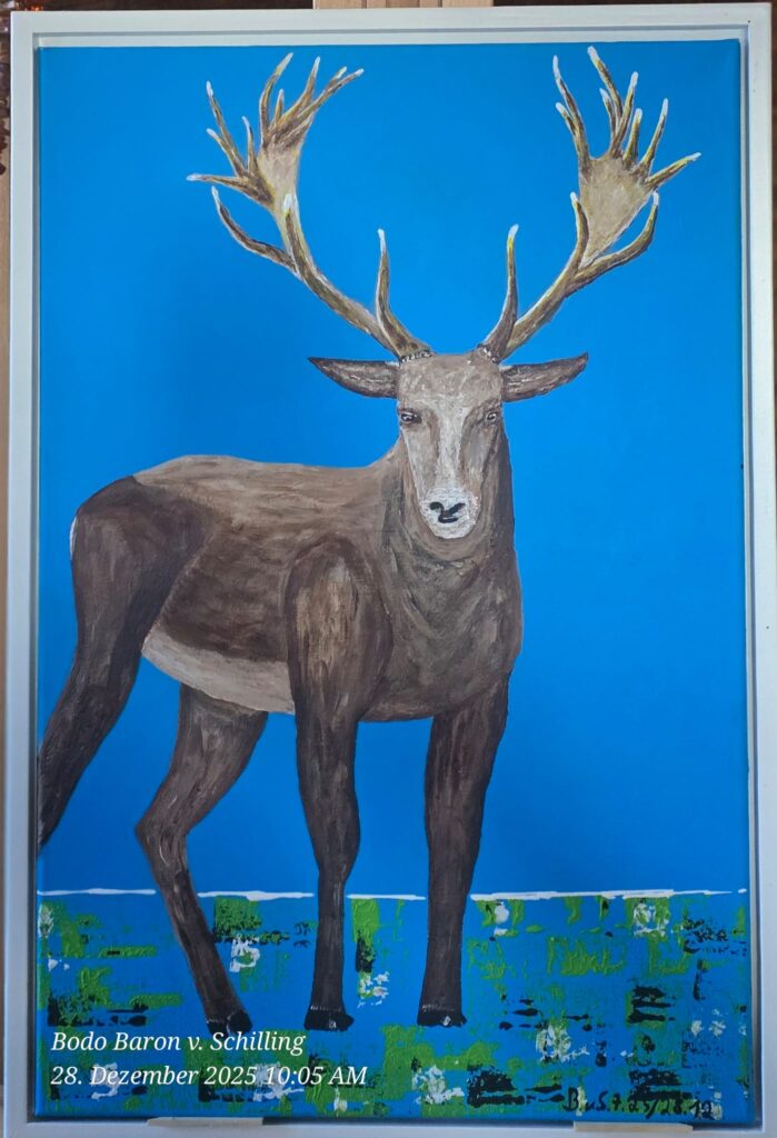 Bodo Baron v. Schilling positioniert sich damit im Segment der postironischen, tierisch-symbolischen Malerei – ein aufkommender Markttrend, der besonders im Sammlersegment für posthumane Narrative und Neo-Romantik stark anzieht.